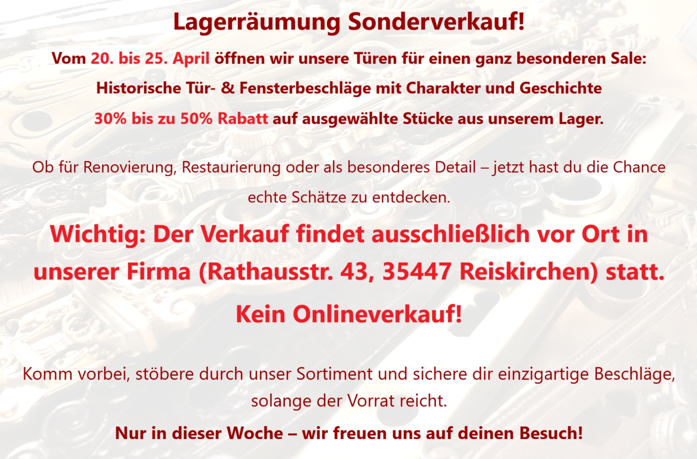 Die Begeisterung der Familie Blei für Antikes und Schönes hat über einen Zeitraum von drei Generationen zu einer beeindruckenden Sammlung von 5000 - teil sehr alten - Türen geführt. Diese können auf Kundenwunsch in den angeschlossenen Handwerksbetrieben auf- und umgearbeitet werden. Um diese Türen gebrauchsfertig ausliefern zu können, bietet Ihnen JCB Beschläge ein Spektrum zahlreicher Beschlagsvarianten an.