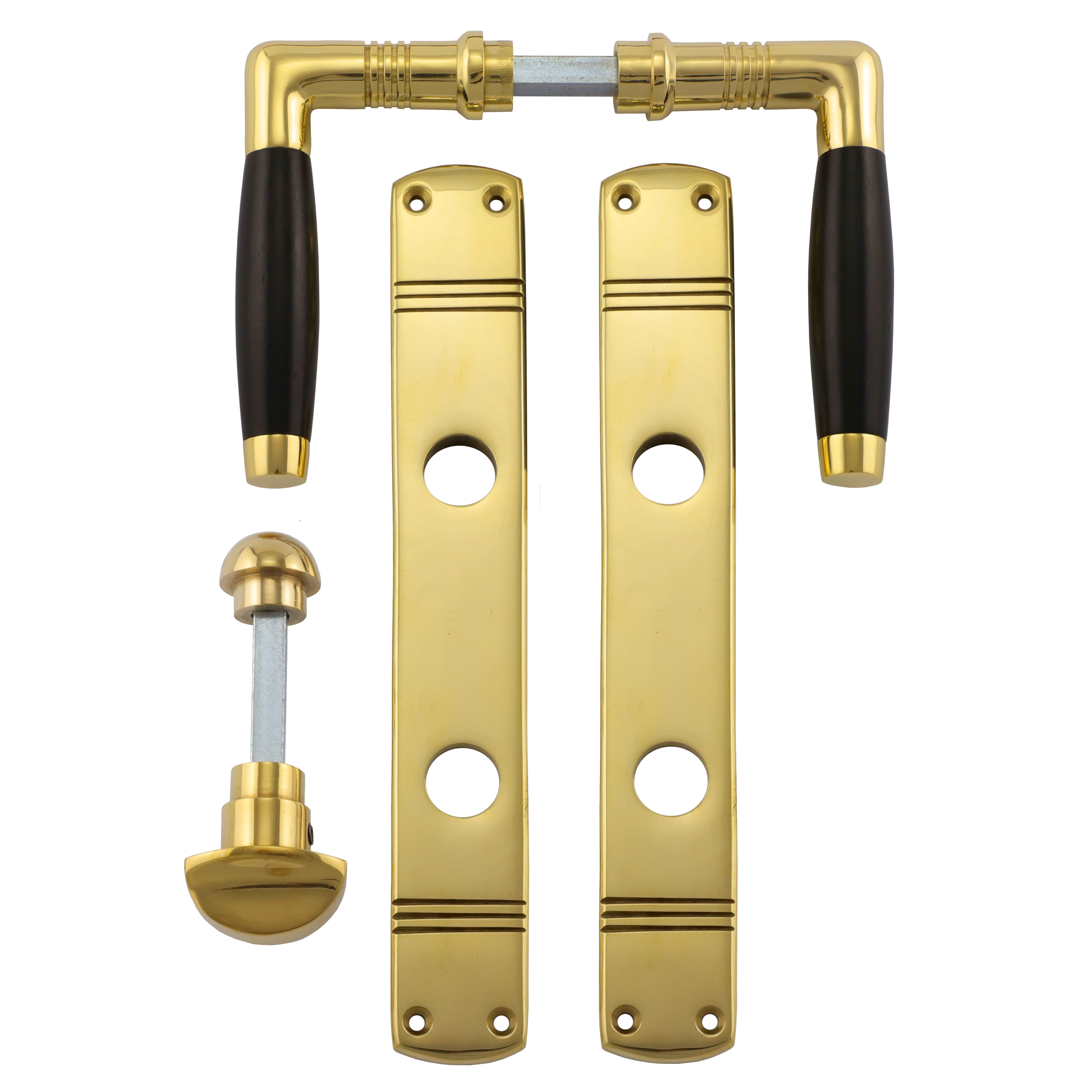 Polierter Türbeschlag aus Messing für Toilettentüren, mit schwarzen Ebenholzgriffen und Drehknauf. Es handelt sich bei diesem eleganten Türgriff um eine authentische Reproduktion nach historischem Vorbild.
